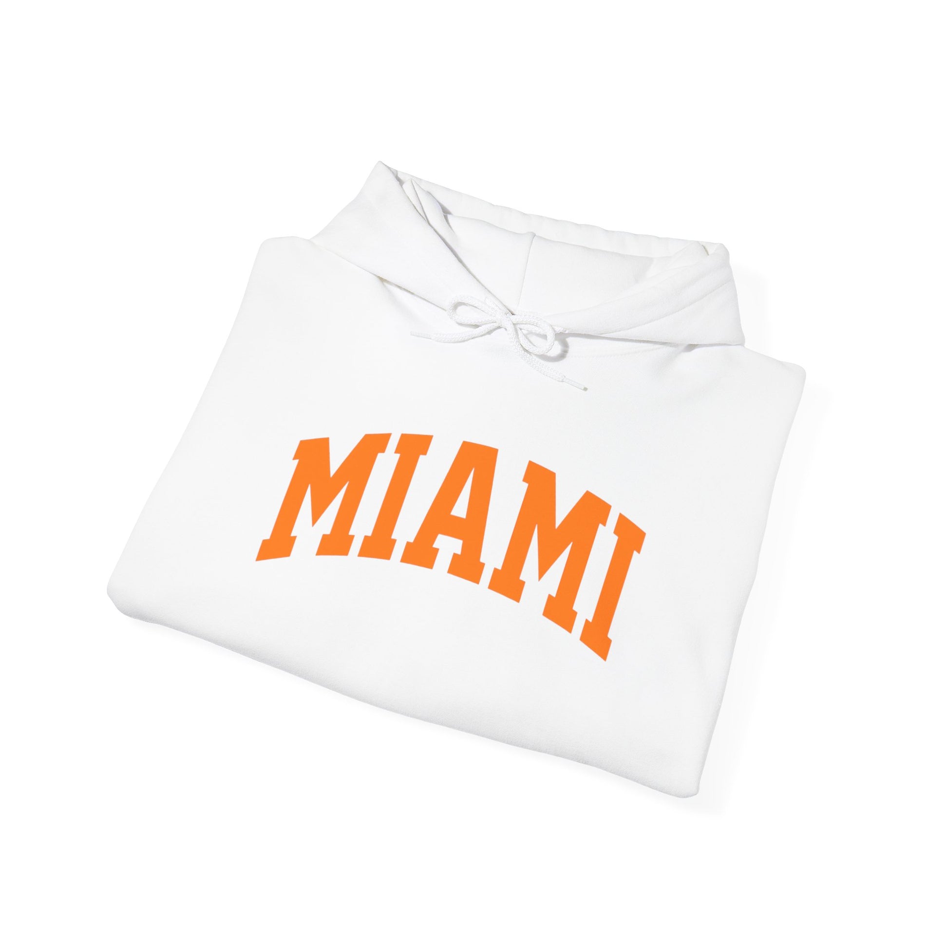 A soft, comfortable hoodie that brings a laid-back Miami vibe to chilly mornings and late-night strolls. The clean white canvas puts a bold, sun-soaked orange "MIAMI" arc front-and-center, evoking boardwalk energy and warm evenings by the water. Wear it over a tee after the beach, or throw it on for weekend coffee runs — the roomy kangaroo pocket and double-lined hood add everyday warmth and a casual, lived-in feel. Subtle details like the color-matched drawcord, tear-away label, and smooth tubular knit keep the fit comfortable and fuss-free, while durable cotton/poly blend holds up to repeated wear and printing methods for a lasting look.